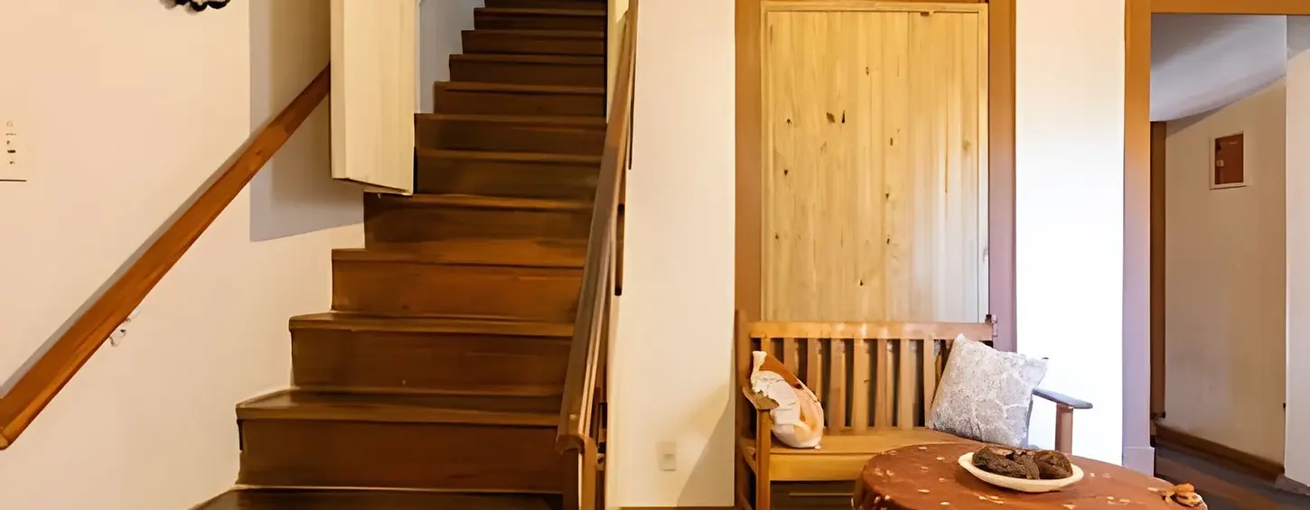Ambiente aconchegante com mesa, banco e acesso coberto aos banheiros.
